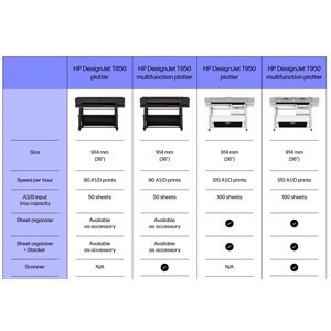 HP DesignJet T950 tiskalnik je na voljo v 2 različnih različicah. V osnovi gre za enak ploter, vendar je razlika med "Standard" in "MFP" v tem, ali imate vgrajeno funkcijo skeniranja.